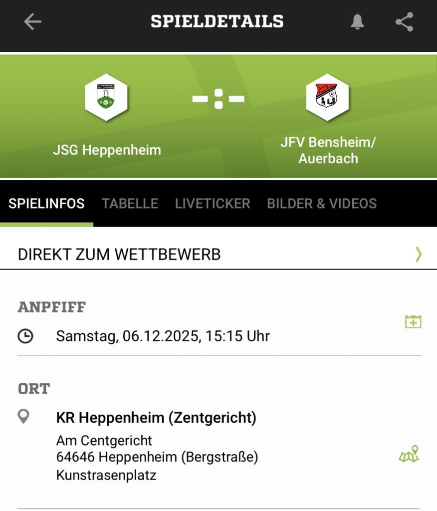 Für alle Heppenheimer die Erinnerung am Samstag die A-Junioren auf dem Galgen zu unterstützen. Der JFV Bensheim/Auerbach wird zu Gast sein. Ein spannendes und intensives Spiel ist garantiert. Kommt vorbei (und danach geht’s auf den Heppenheimer Nikolausmarkt😉).